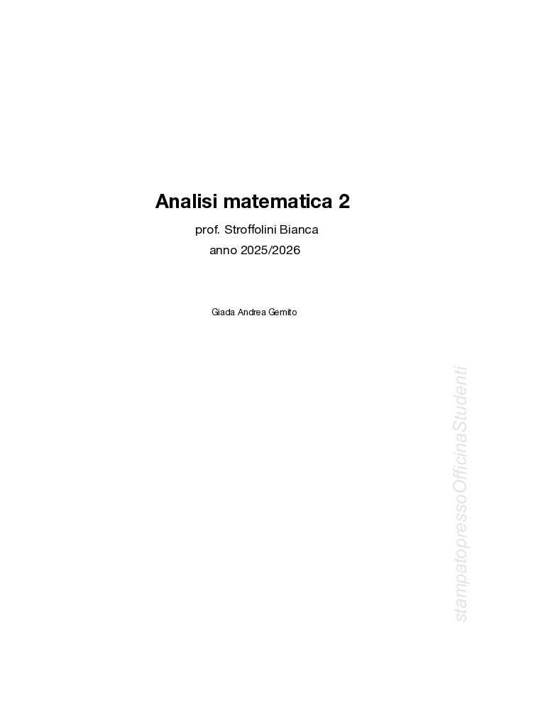 Questi sono gli appunti, da me presi, delle lezioni e spiegazioni della professoressa Stroffolini Bianca nell’anno accademico 2025/2026. Sono frutto di un lavoro di integrazione fatto da Giada Andrea Gemito, un insieme approfondito delle spiegazioni della professoressa e del libro di Analisi di Marcellini-Sbordone-Fusco.