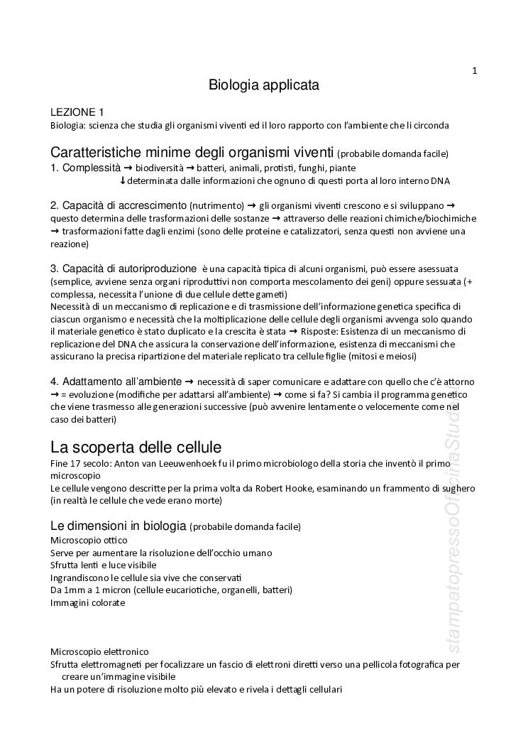 Appunti del corso di Biologia Applicata tenuto dal prof Pistocchi e redatti da Nadia Zouhir