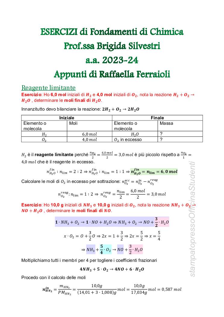 Questo file comprende tutti gli esercizi svolti durante il corso di Fondamenti di Chimica tenuto dalla prof.ssa Brigida Silvestri durante il II semestre dell’anno accademico 2023-24 -esercizi svolti in classe con la professoressa -esercizi svolti durante i tutorati con la professoressa -prove intercorso degli anni precedenti svolte redatti da Raffaella Ferraioli