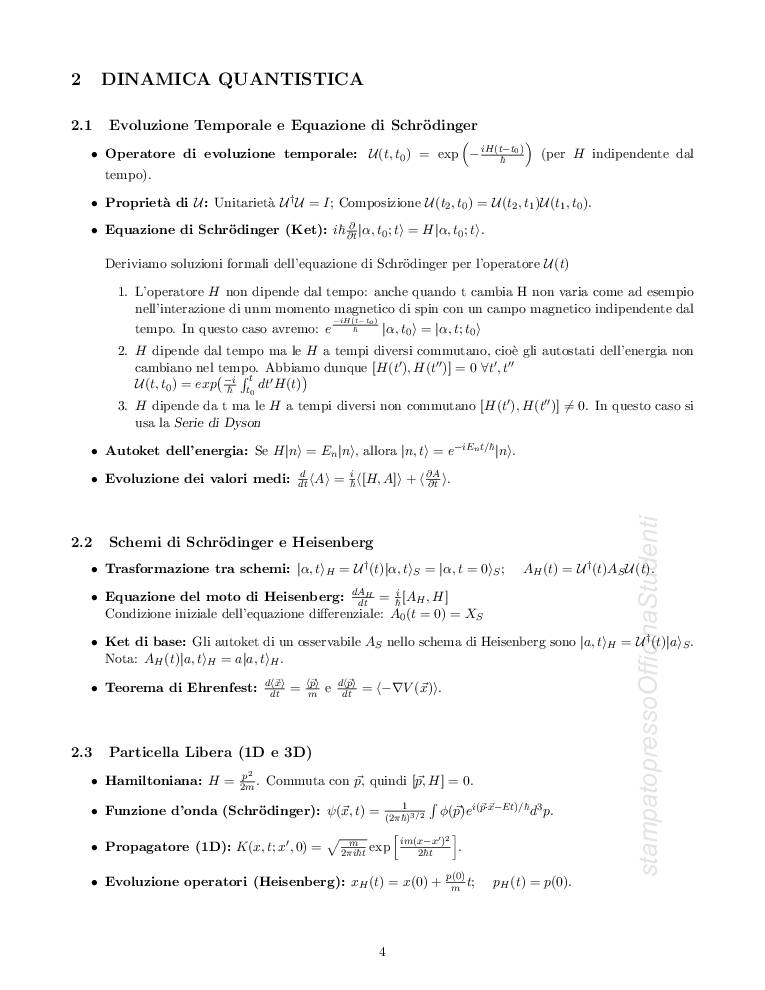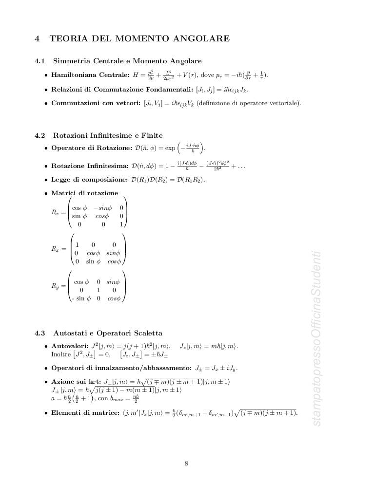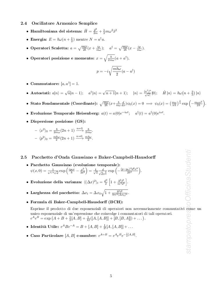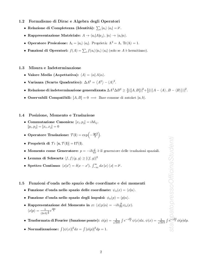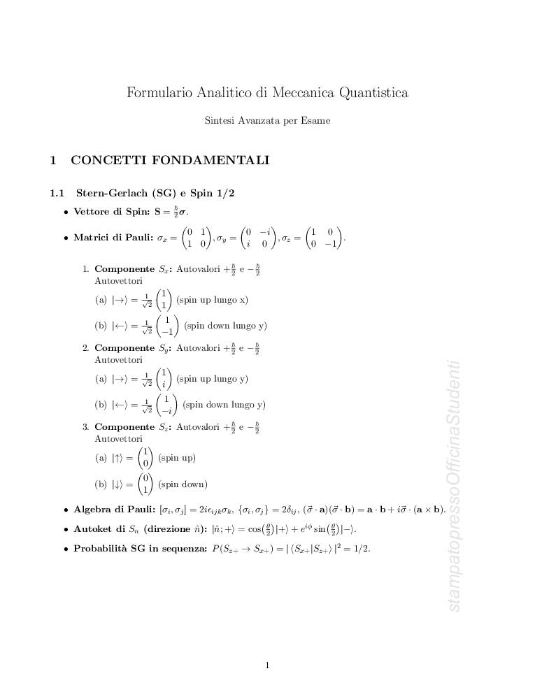 Il documento contiene tutte le formule necessarie da conoscere per il corso di meccanica quantistica. è diviso in macro sezioni come: concetti fondamentali, meccanica ondulatoria, dinamica quantistica, atomo di idrogeno e simmetria centrale, teoria del momento angolare, metodi di approssimazione e particelle identiche. Ogni sezione è divisa in ulteriori paragrafi. Alcune formule hanno approfondimenti e spiegazioni. In più c’è una pagina bonus che contiene formule necessarie da conoscere per lo svolgimento di integrali e bonus per velocizzare i calcoli Appunti del corso tenuto dal prof Papa e redatti da Caterina Astorino