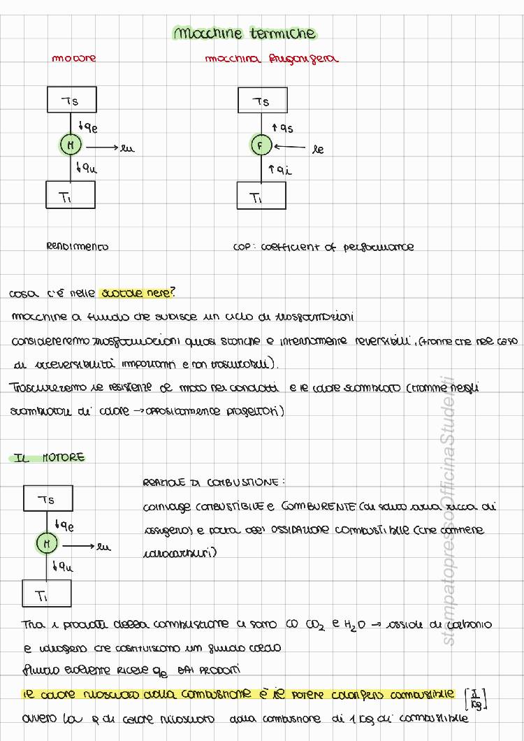 Appunti redatti da Francesca Gala. Analisi e descrizione dei componenti e del funzionamento delle principali macchine termiche e grafici commentati per ciascuno di essi, fondamentali per la risoluzione degli esercizi. Nel documento sono presenti: Motori termici: motori a ciclo Joule Bryton (anche con rigenerazione), a ciclo Rankine (anche con surriscaldamento), motori alternativi a ciclo otto (due tempi e quattro tempi) e ciclo diesel. Macchina frigorifera con valvola di laminazione. esame già svolto con una valutazione di 30L