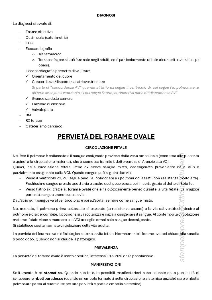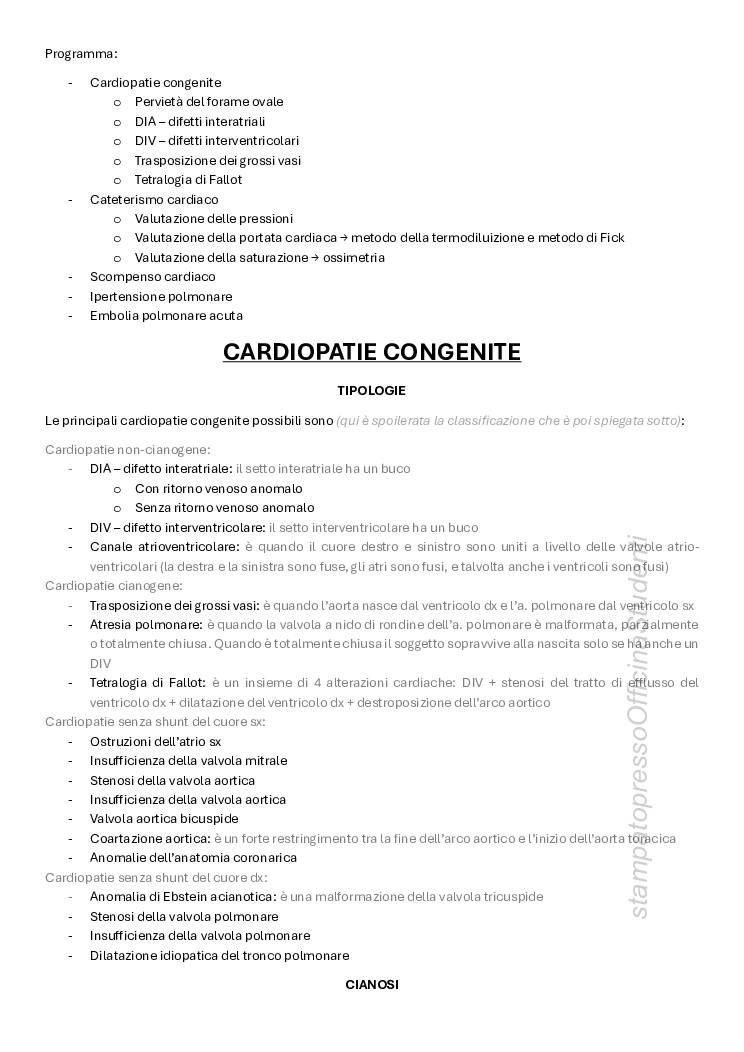 Appunti sistemati e integrati con linee guida e classificazioni PubMed su: – Cardiopatie congenite o Pervietà del forame ovale o DIA – difetti interatriali o DIV – difetti interventricolari o Trasposizione dei grossi vasi o Tetralogia di Fallot – Cateterismo cardiaco o Valutazione delle pressioni o Valutazione della portata cardiaca ? metodo della termodiluizione e metodo di Fick o Valutazione della saturazione ? ossimetria – Scompenso cardiaco – Ipertensione polmonare – Embolia polmonare acuta prof Palazzini redatti da Angelica Zordan