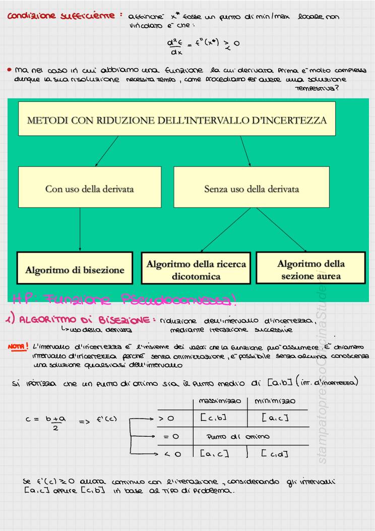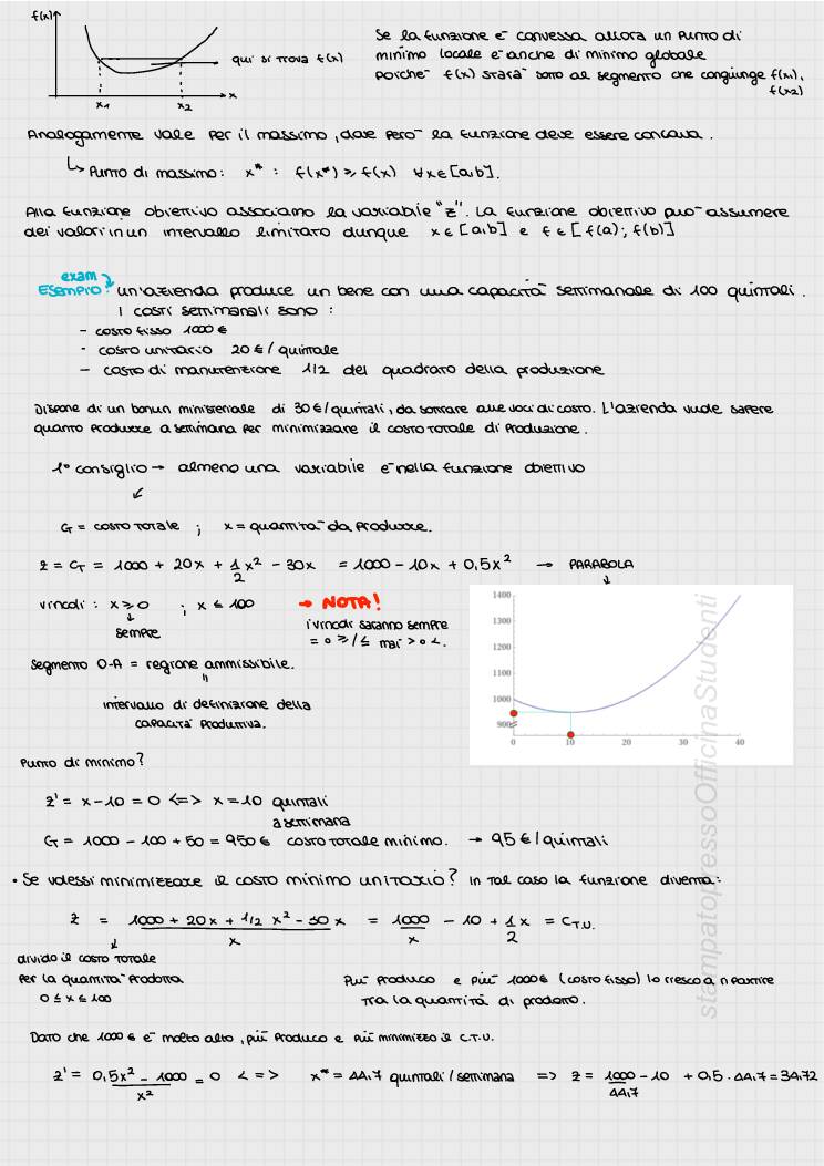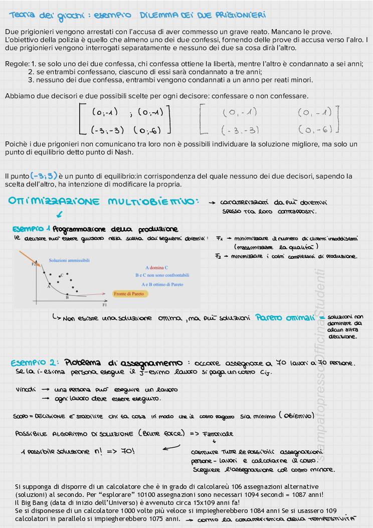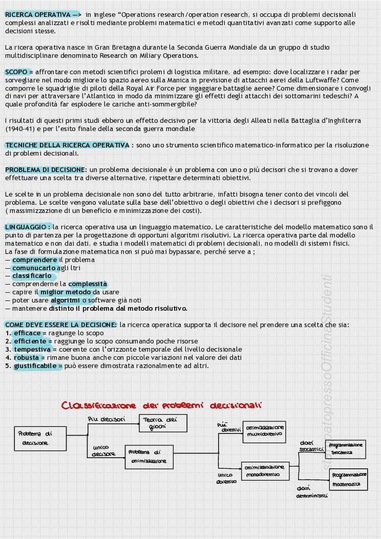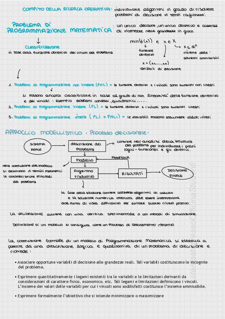 Appunti del corso di Ricerca Operativa tenuto dal prof Masone e redatti da Annarita Vitulano. Dispense delle lezioni. Programmazione non lineare monodimensionale: algoritmo di bisezione e algoritmo di ricerca dicotomica; Programmazione non lineare multidimensionale non vincolata: algoritmo di discesa/salita ripida; Programmazione non lineare multidimensionale vincolata con l’algoritmo di discesa ripida; Programmazione lineare: algoritmo del simplesso; modello duale; analisi post-ottimale, Problema dell’assegnamento; problema dello zaino e problema del cutting stock nelle due formulazioni con le tre diverse funzioni obiettivo. Teoria dei grafi, visita di un grafo in larghezza, e visita di un grafo in profondità; Problemi su rete: problema di minimo percorso; problema di trasporto, problema di flusso; Tecniche reticolari per la programmazione e la gestione e il controllo di un progetto.
