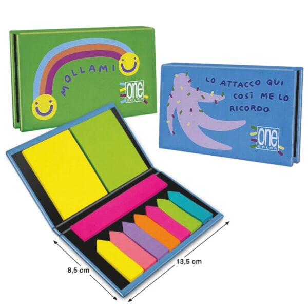 Il blocco Stickers One Color DISEGNETTI DEPRESSETTI è realizzato in cartone rigido (formato 8,5×13,5 cm) e contiene segnapagina adesivi in tre diversi formati.