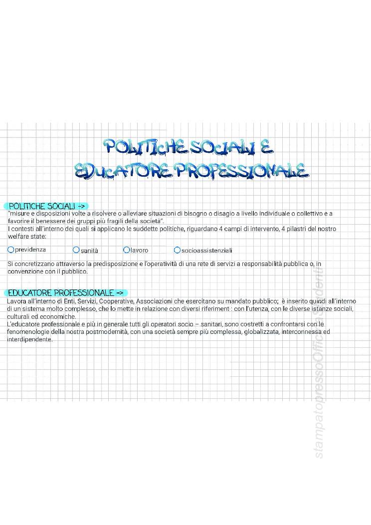 È una sorta di diritto per tutti coloro che vorranno diventare educatori professionali. Al suo interno si trova: politiche sociali, walfare state e mix, reti sociali, stato sociale, globalizzazione, terzo settore, riqualificazione urbana, differenze tra governo e governance, e infine alcune norme importanti da ricordare.