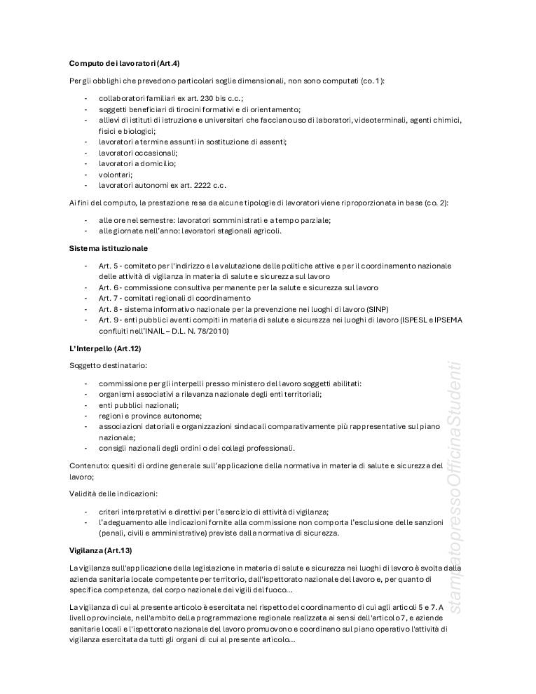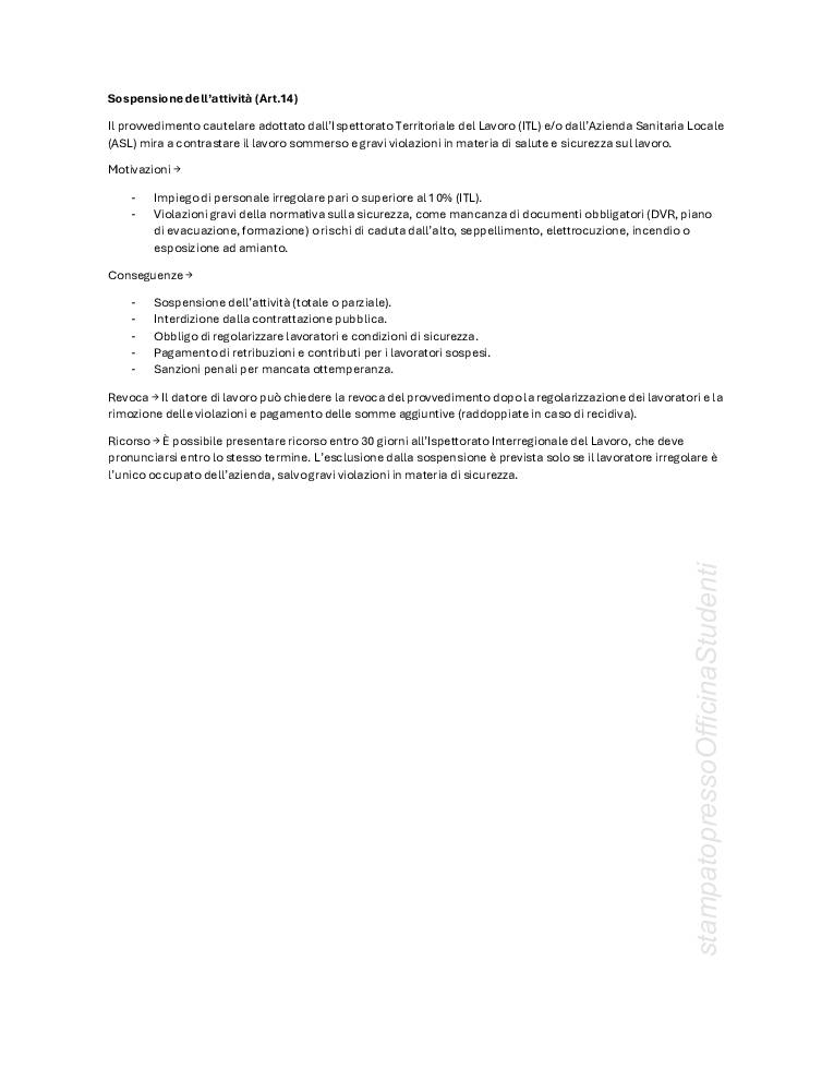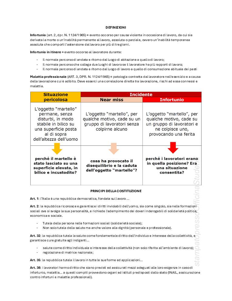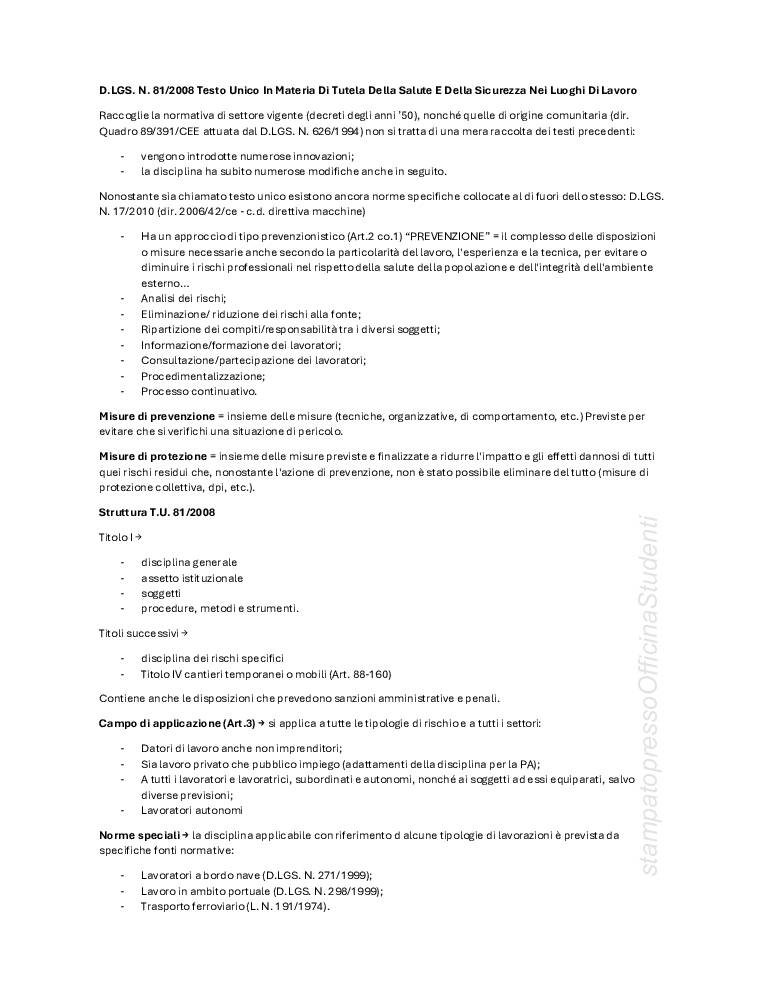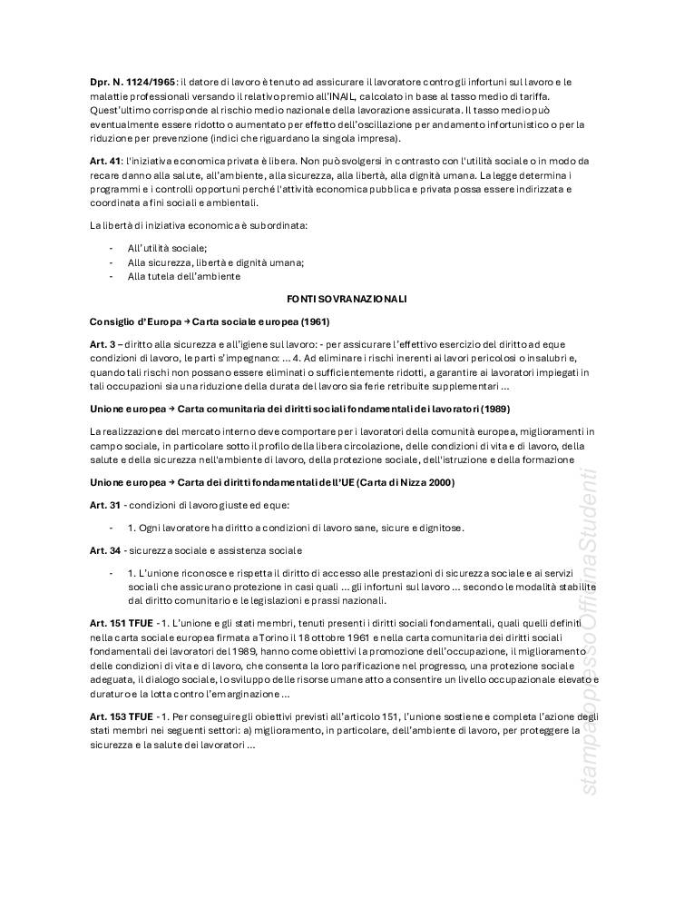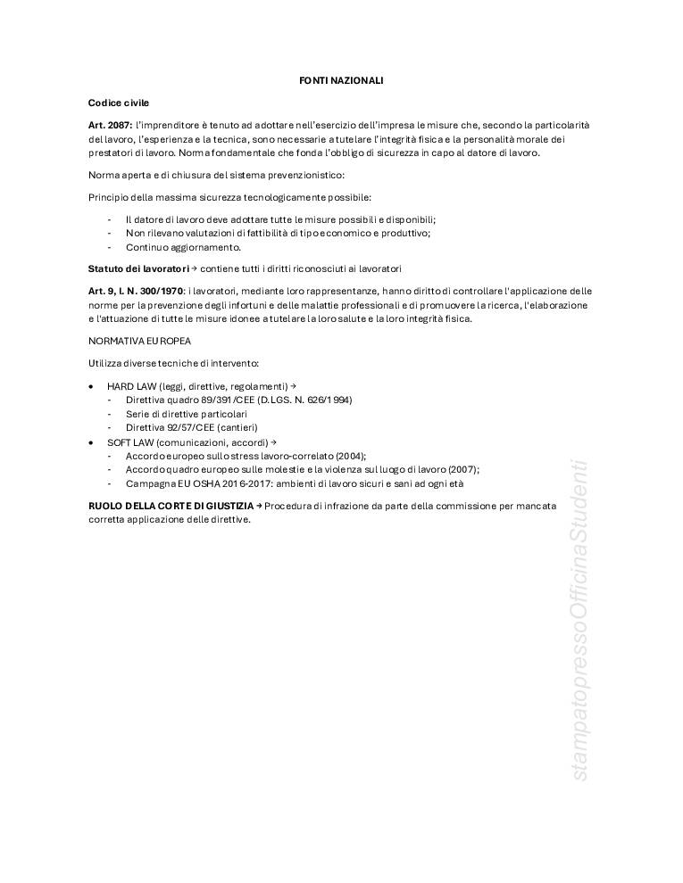 PDF creato con appunti a lezione e integrato con le slide fornite dal prof Bonanomi, redatti da Anna Patarini. Argomenti trattati: definizioni base (danno, infortunio, malattia professionale, rischio pericolo, ecc…) principi della costituzione, fonti sovranazionali, nazionali, europee, T.U. 81/2008, interpello, vigilanza, sospensione dell’attività, lavoro subordinato, autonomo e parasubordinato, soggetti della sicurezza (lavoratore, datore di lavoro, dirigenti, preposti, RLS, RSPP, SPP, medico competente), riunione periodica, sanzioni, MOG, valutazione dei rischi, DVR, DUVRI, appalti.