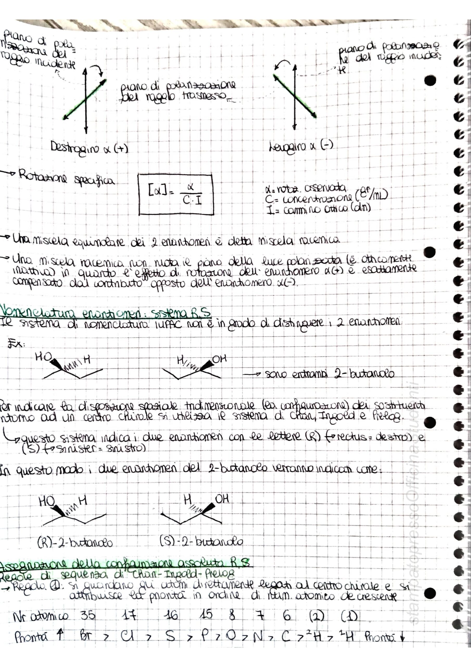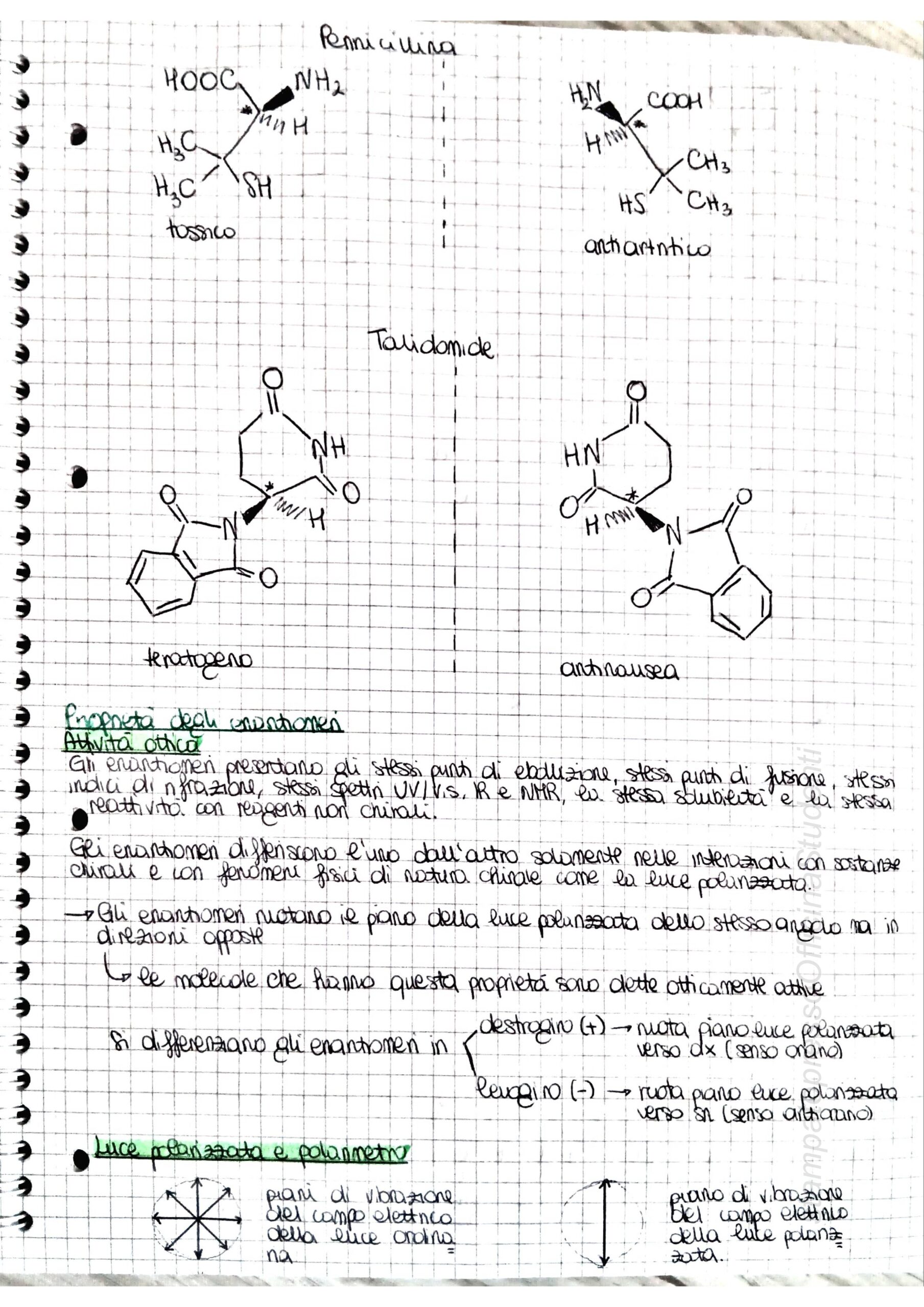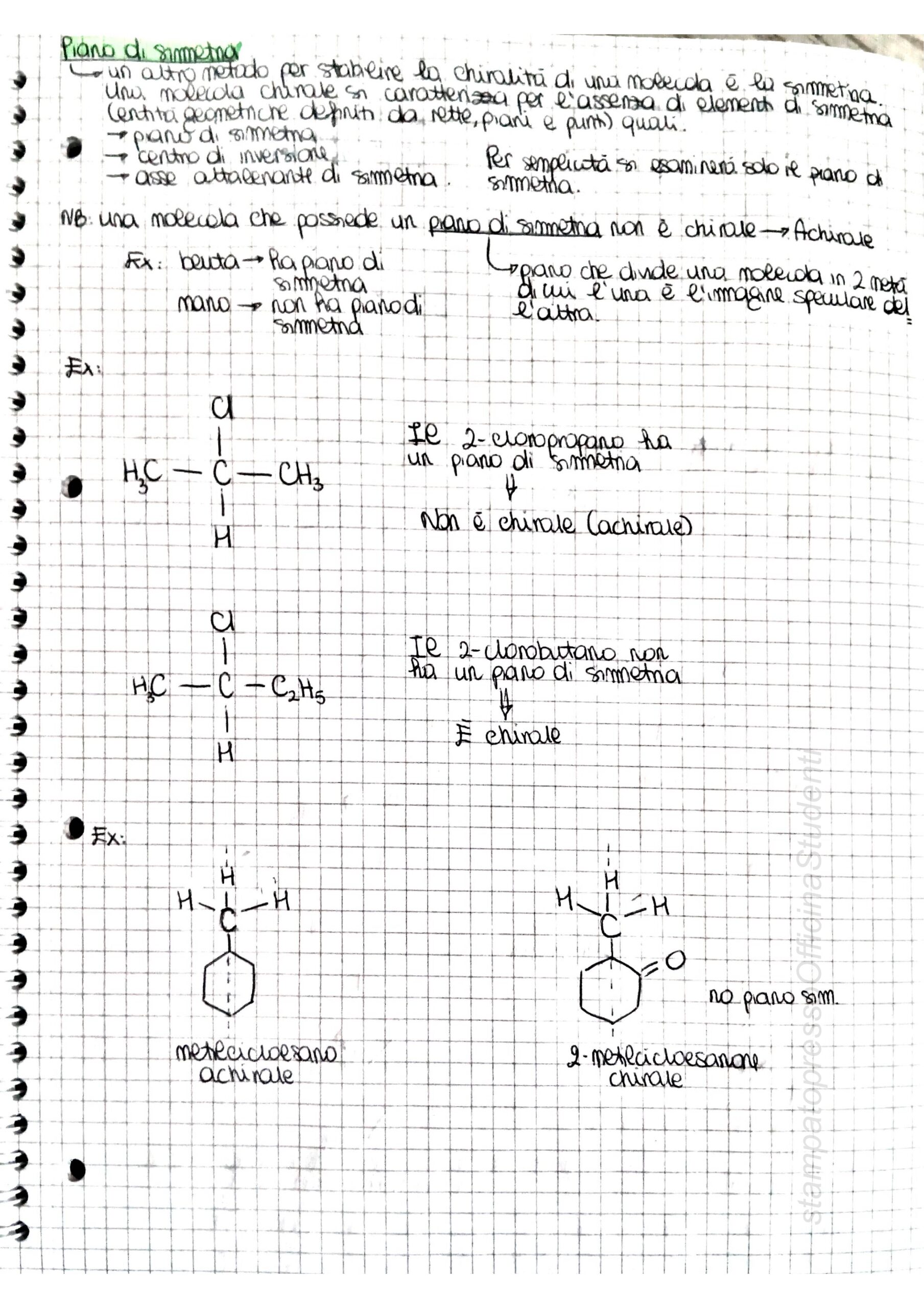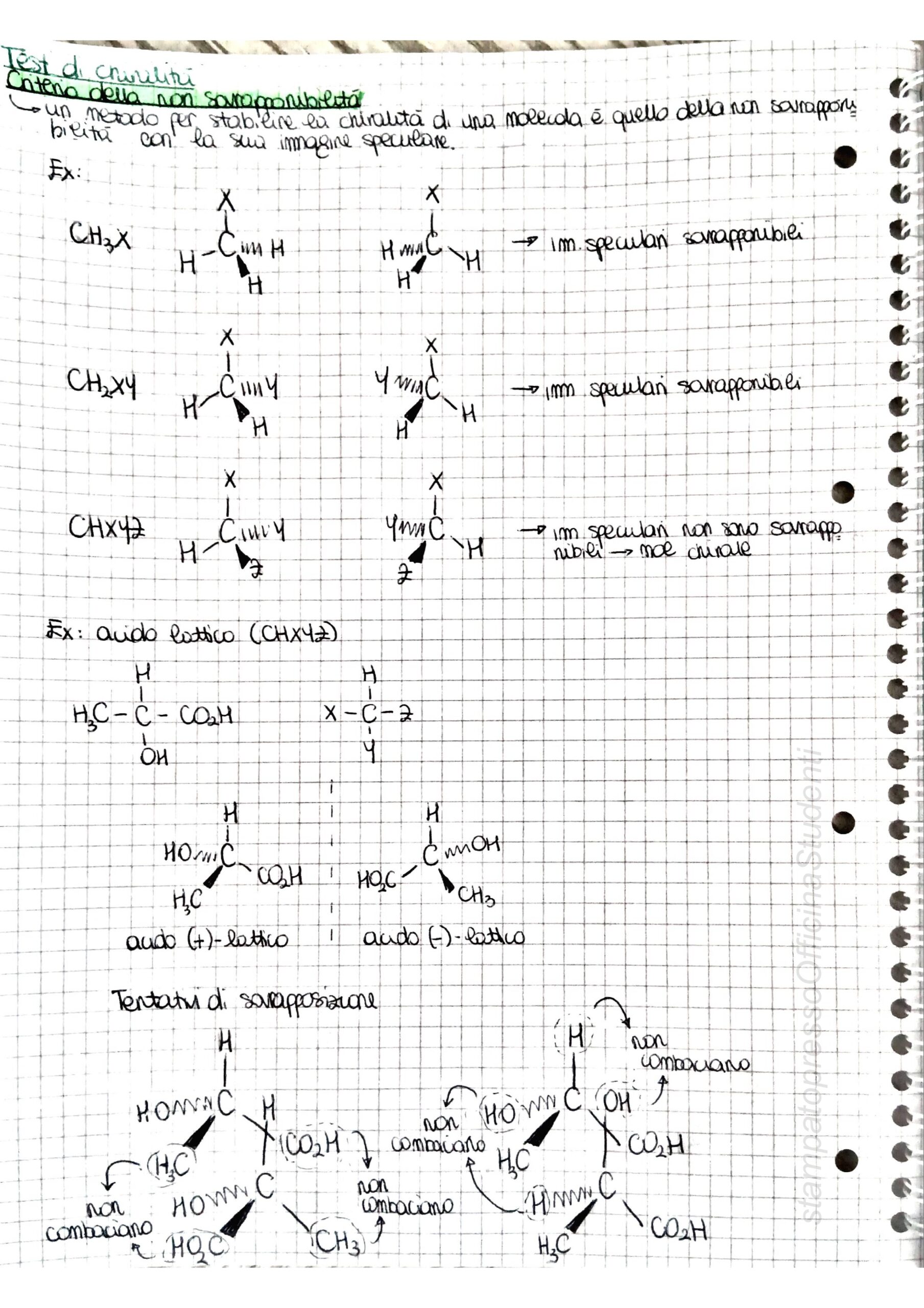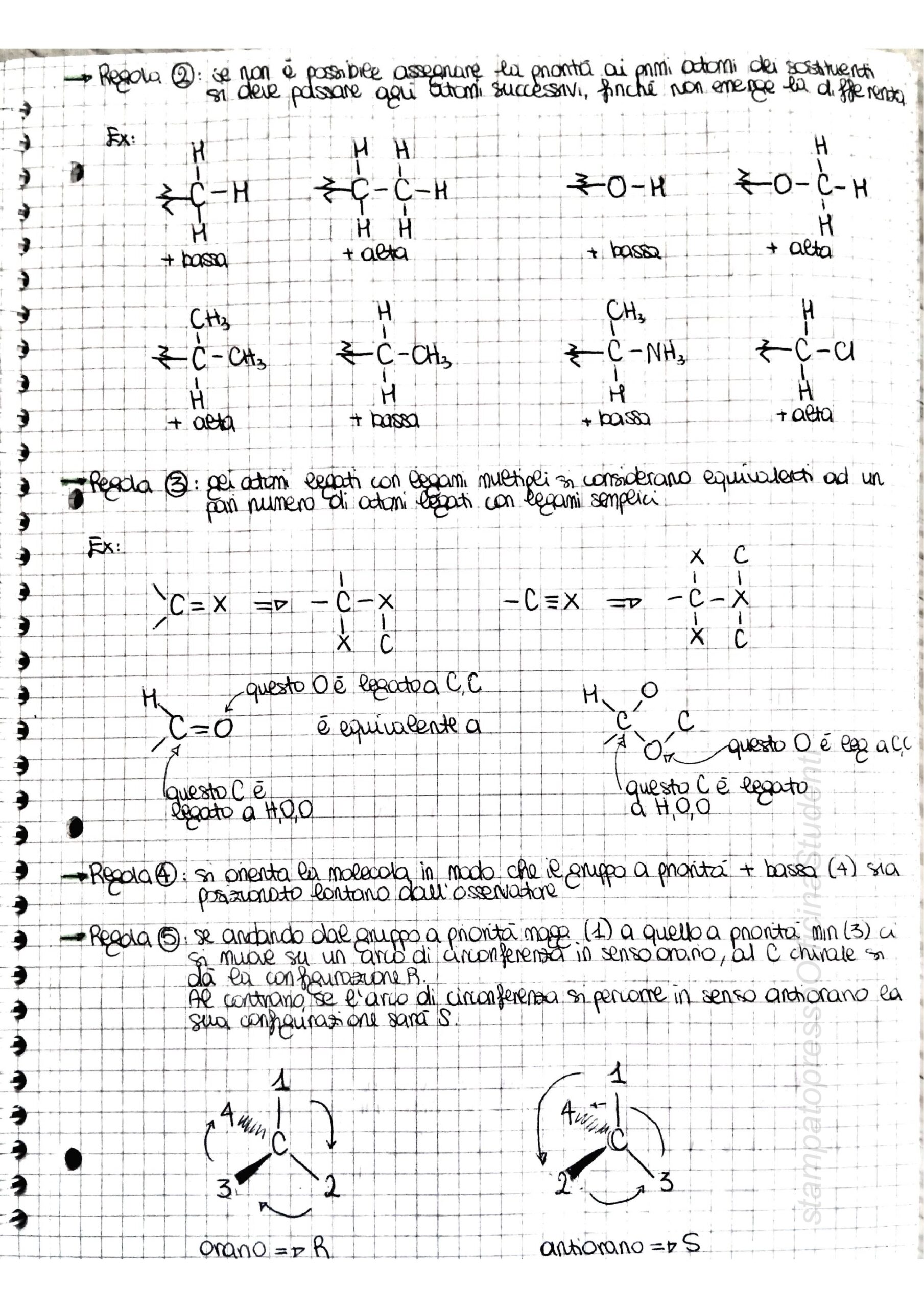 Introduzione alla stereochimica, Chiralità, Enantiomeri, Test di chiralità (criterio della sovrapponibilità e piano di simmetria), Proprietà degli enantiomeri (attività ottica, polarimetro e luca polarizzata), Assegnazione della configurazione assoluta R,S (regola di sequenza di Chan-Ingold-Prelog), Proiezioni di Fisher, Molecole con piu centri chirali, Composti MESO, Risoluzione di una miscela racemica, Isomeria e Prochiralità. Appunti del corso tenuto dal prof Piermatti e redatti da Fabiola Mignani