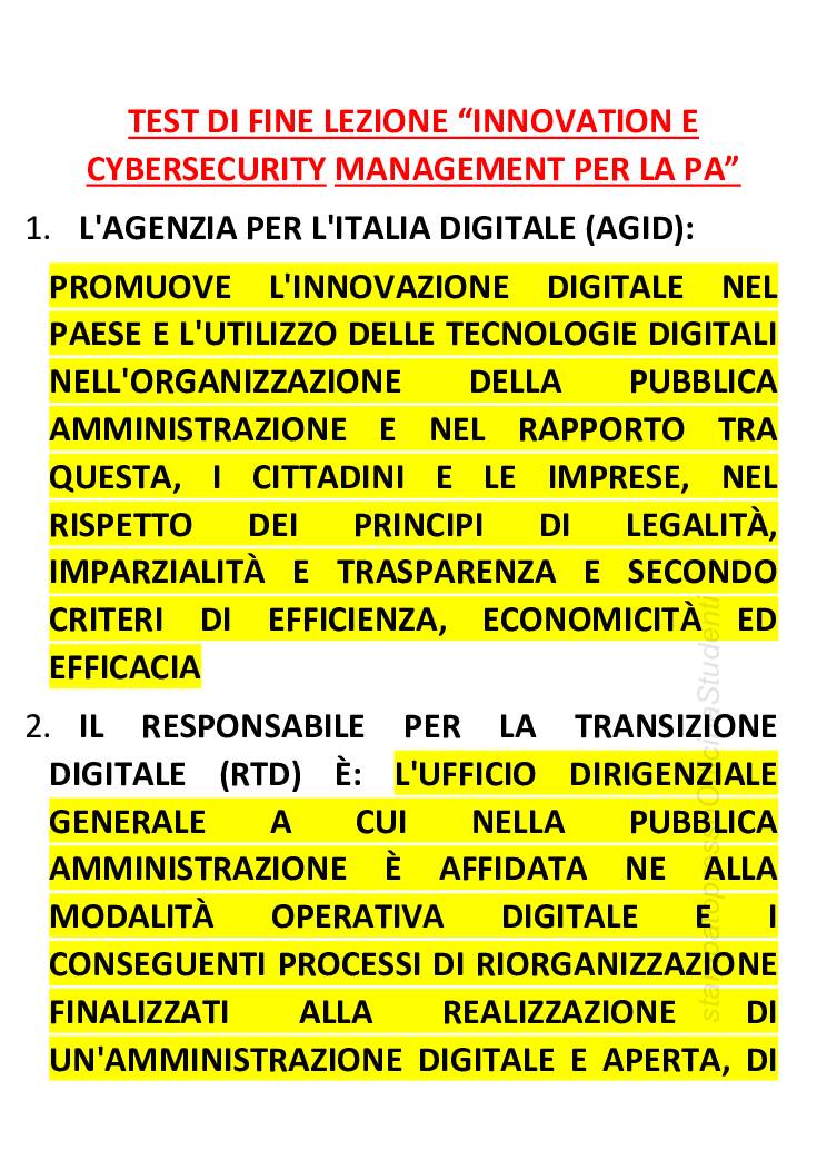 TEST DI FINE LEZIONE DELLA MATERIA: INNOVATION & CYBERSECURITY MANAGEMENT PER LA PA – CORSO DI LAUREA MAGISTRALE IN SCIENZE DELL’ECONOMIA LM-56 INDIRIZZO: GOVERNO E TRASFORMAZIONE DIGITALE NELLA PA – UNIVERSITA’ TELEMATICA PEGASO – DOCENTI: PROF.SSA LUCIA PIZZICHINI e PROF. CRISTIANO MICHELE GABRIELE